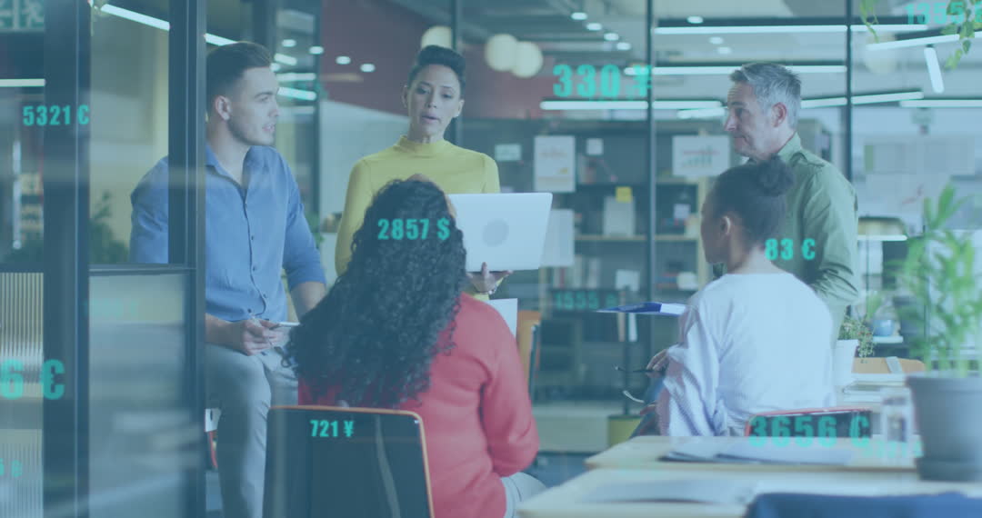 A diverse group of colleagues is engaged in a discussion within a modern office environment. A digital overlay depicting data processing elements adds a layer of technological innovation. Useful for illustrating concepts of teamwork, business technology integration, or digital transformation in a corporate setting.