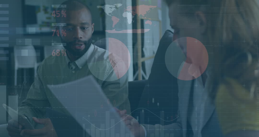 Two business professionals engaged in a discussion in a modern office, with data and analytics visuals overlaid. This illustrates collaboration and digital transformation within a global business context. Ideal for themes of teamwork, data analysis, technology, corporate environments, and diversity in the workplace.