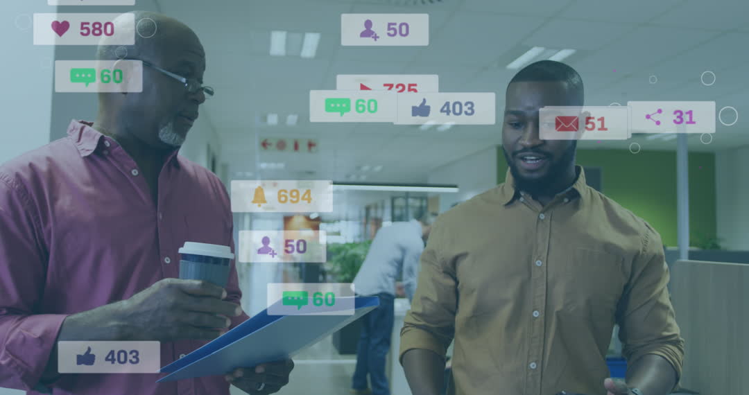 Two professionals, engaged in a dynamic discussion, symbolize modern office collaboration and the importance of digital connectivity. Social media notification icons overlayed capture the essence of digital engagement in professional settings. Ideal for illustrating concepts of teamwork in digital strategy, online marketing trends, or efficient workplace communication.