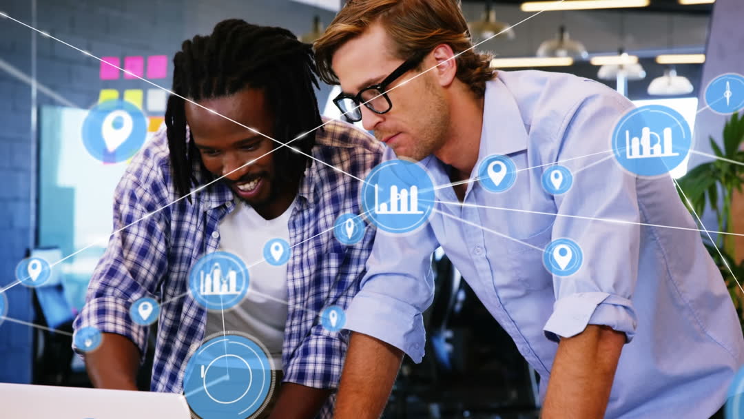 Two diverse professionals engaging in a conversation while looking at a laptop, overlaid with digital network icons, suggesting themes of modern workplace technology and global communication. Useful for illustrating concepts in business technology, digital transformation, or startup collaboration environments.