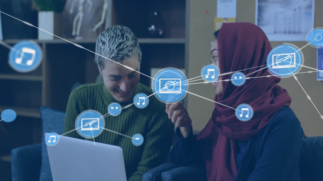 Two colleagues engaging in discussion about digital networking while visual icons overlay. This scene can illustrate teamwork and innovation in a modern workspace. Useful for topics related to business technology and collaboration.