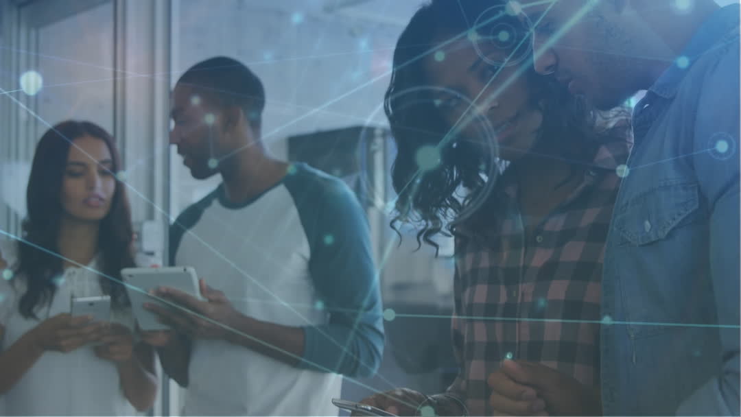 Diverse Colleagues Discussing Tech with Network Connections Overlay Video