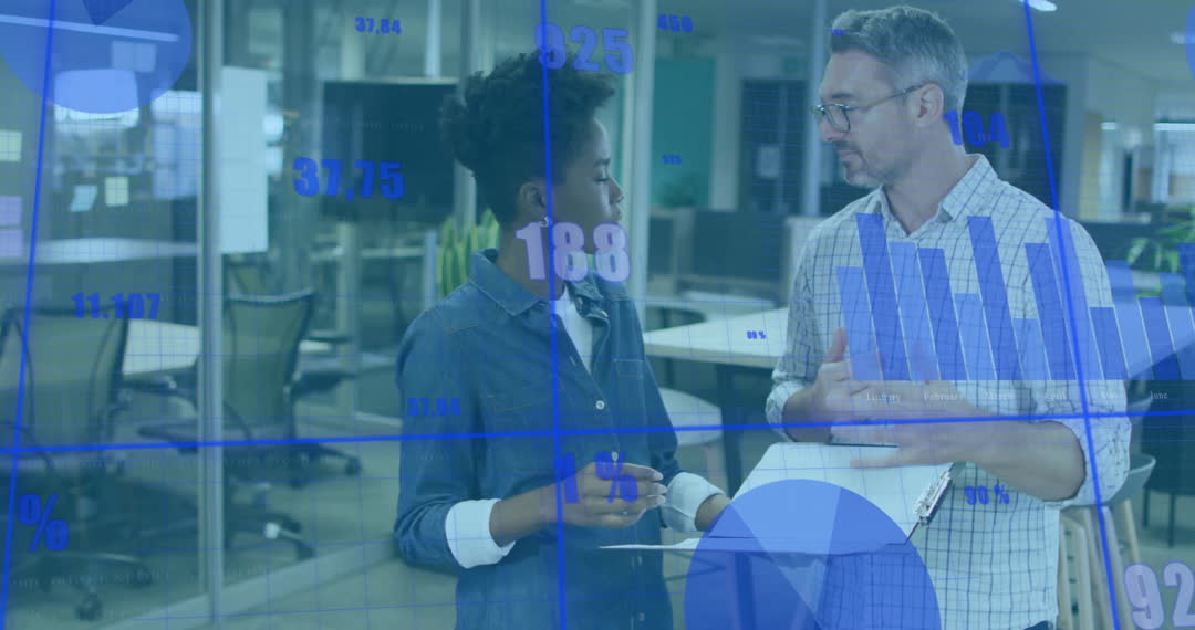 Image shows two colleagues talking, overlaid with data graphs and charts. This composition suggests a focus on business analytics, collaboration, and team discussions in a professional setting. Perfect for use in business presentations, workplace environments, or any content involving data analysis and professional teamwork.
