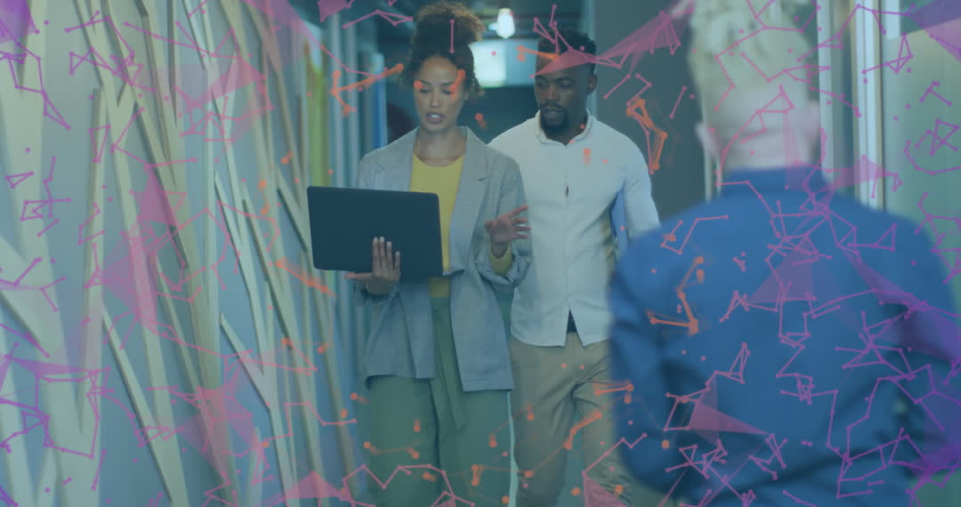 Colleagues from various backgrounds walking through office hallway while engaging with laptop for a project. Suitable for showcasing teamwork, office culture, and diverse workplace environments in promotional or website materials.