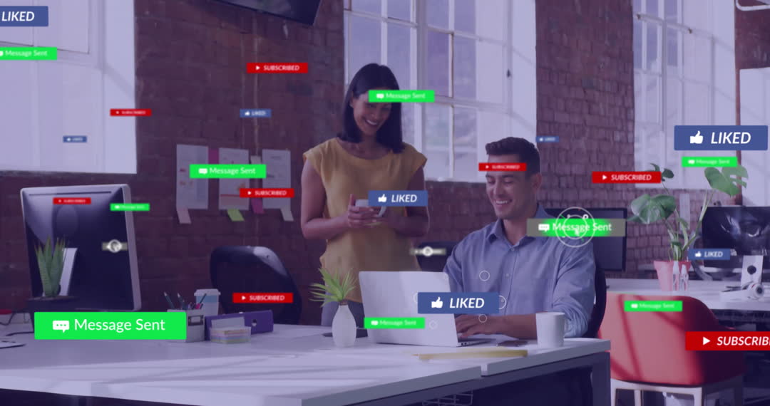 This vibrant depiction captures a diverse group of colleagues discussing social media engagement in an animated, modern office space with abstract interface elements like likes and messages overlaying. Perfect for illustrating diverse teamwork, contemporary business environments, or social media strategy discussions in digital marketing materials.
