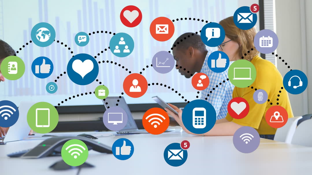 This depiction of colleagues interacting with a set of vibrant digital logos illustrates the importance of connectivity, communication, and modern technology in a professional setting. The colorful icons reflect emails, social media, wireless signals, and more, fostering ideas around innovative teamwork and cutting-edge connectivity. Ideal for use in presentations or articles involving digital transformation, teamwork dynamics, or advances in communication technology.