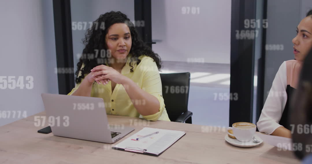 Colleagues sitting at table discussing strategies, with digital data overlay symbolizing a technology-driven workspace. Cup of coffee and documents around laptop hint at a productive environment focused on digital transformation. Suitable for content on collaborative workspaces, tech-driven corporate settings, or data-integration in modern business environments.