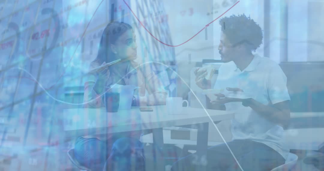 Two colleagues enjoying lunch in an office are seen overlaid with dynamic digital data graphs, representing the intersection of human interaction and data-driven business environments. Suitable for illustrating modern business practices, workplace diversity, and fostering collaborative environments in tech-centric industries.