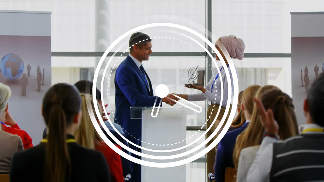 The scene captures a business presentation where diverse colleagues exchange a handshake, encapsulated by an animated clock overlay, indicating the importance of time in business settings. The gathering of a multicultural team contributes to the environment's professionalism, hinting at subjects like teamwork, global business success, and time management. This scene is useful for illustrating concepts in leadership, business seminars, conference success, and international collaborations.
