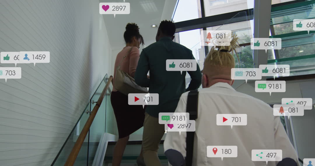 Office workers climbing stairs surrounded by floating social media icons. Could be used to illustrate the influence of social media in the modern workplace, or the integration of technology in business settings. Useful for advertising social media tools, business networking applications, or technology solutions for professional environments.