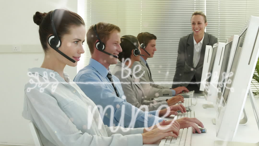 Consultants wearing headsets working in lively, modern office space. Engaged in communication and teamwork using computers, illustrating a professional environment centered on customer service. 'Be mine' animation overlay adds an artistic layer. Useful for illustrating topics like business operations, teamwork, communication, and professional workspaces in corporate settings.