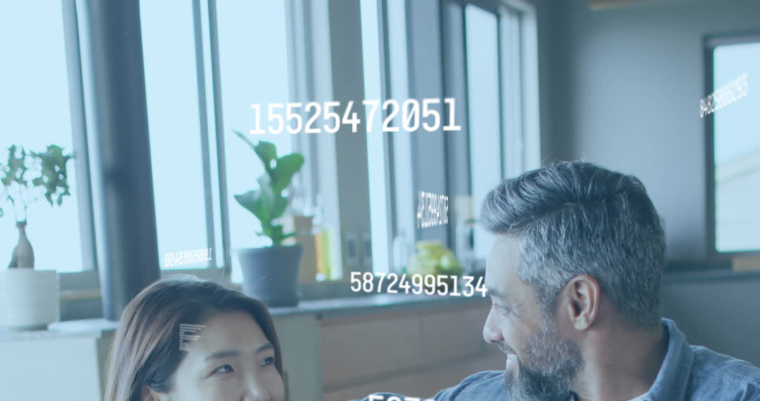 - Diverse Couple Analyzing Digital Data with Dynamic Numbers Display