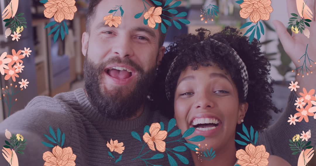 Diverse Couple Embracing Surrounded by Animated Floral Designs Video