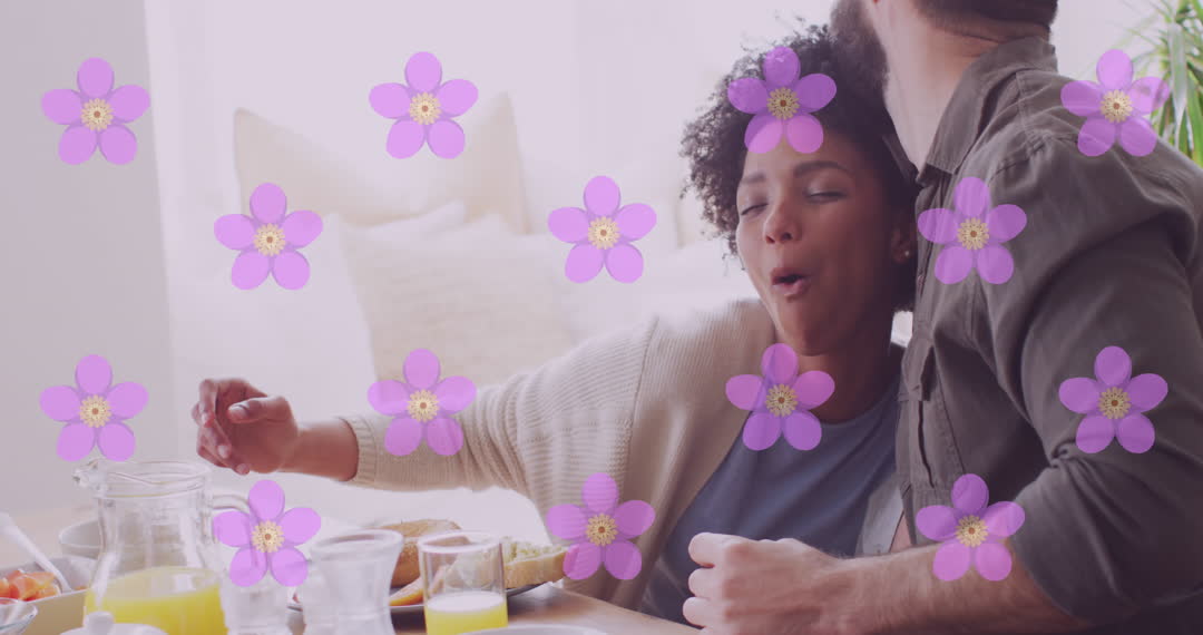 - Diverse Couple Enjoying Breakfast with Flower Overlay