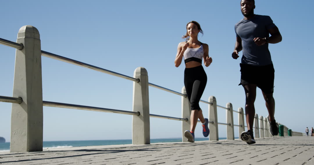 - Diverse Couple Jogging by Ocean on Sunny Day Promenade