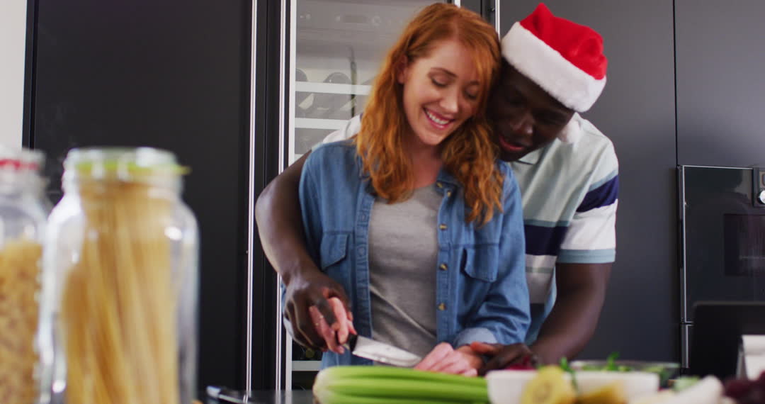 Young interracial couple enjoy preparing a meal in modern kitchen. Woman guides man's hand while chopping ingredients, both smiling warmly. Man wears a festive Santa hat, hinting at a Christmas theme. Perfect for themes about togetherness, cooking bonding moments, holiday season, and happy lifestyles.