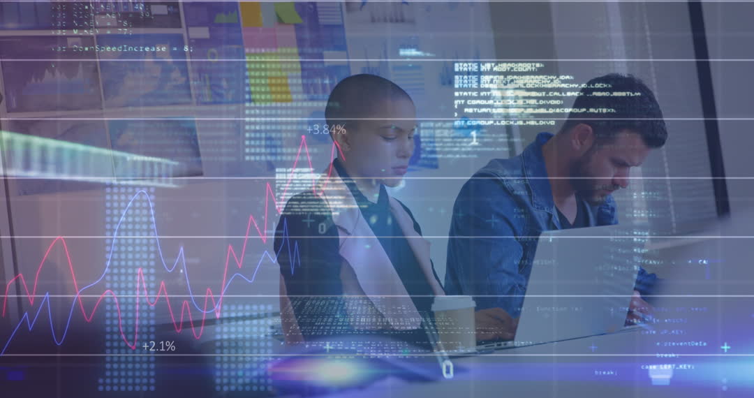 Business professionals collaborate on a project related to data analysis, merging digital technology and finance. Graphs, binary code, and programming elements intersect with focused teamwork. Useful for technology-related storytelling, presentations on data analysis, or promotional materials in the finance or tech industry.