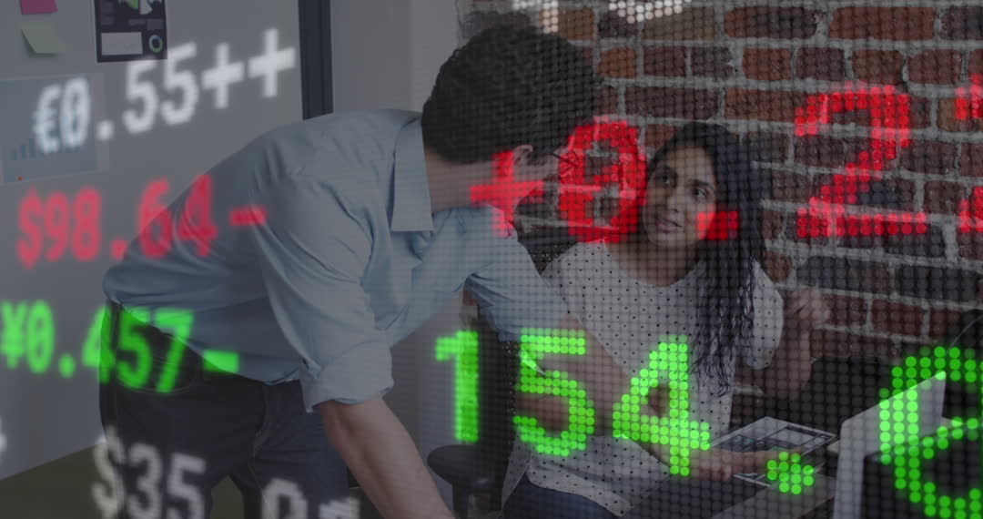 This vibrant scene depicts diverse coworkers engaged in analyzing financial data with an overlaid digital stock market trading board. It beautifully integrates teamwork and technology and is perfect for illustrating financial reports, market analysis, corporate websites, and presentations discussing trends in finance and collaborative work environments.