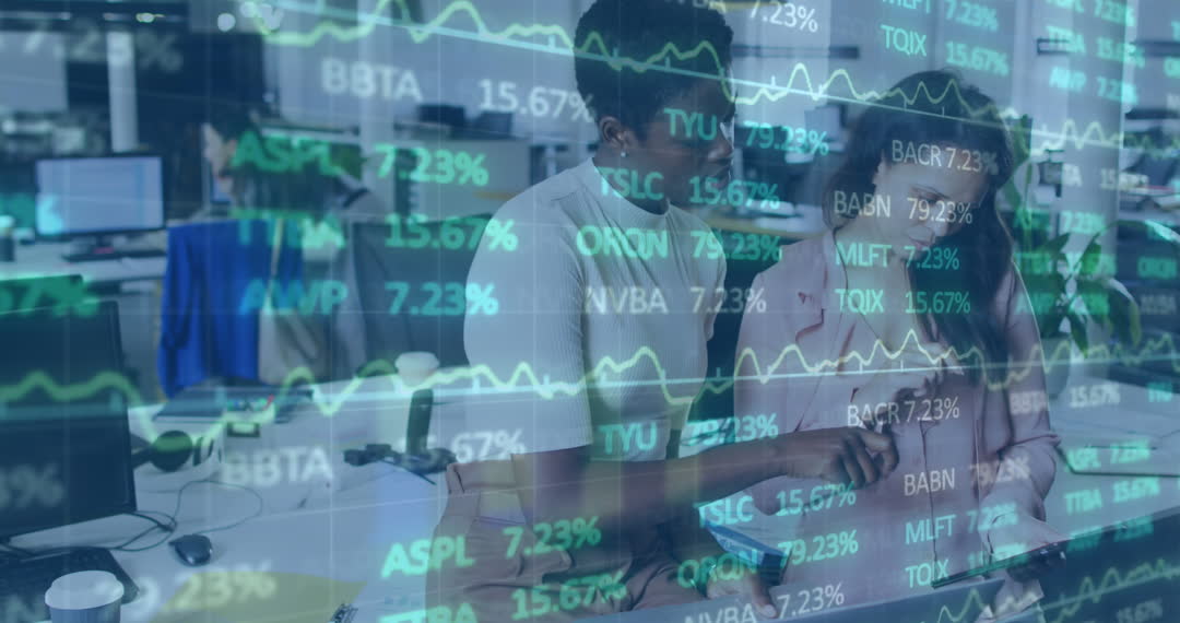 - Diverse Coworkers Analyzing Reports with Stock Market Overlay