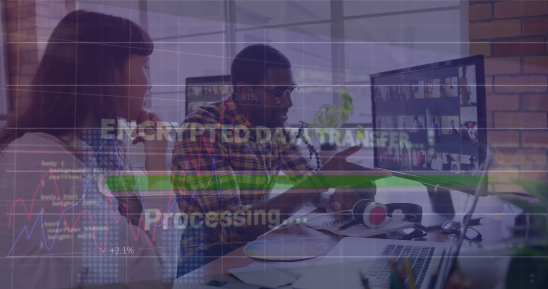 Diverse coworkers engaging in discussion at a desk with a high-tech interface overlay, indicating a corporate or business setup focused on digital innovation. Perfect for illustrating concepts of modern teamwork, technological advancement in the workplace, or digital data processes for reports or marketing materials.