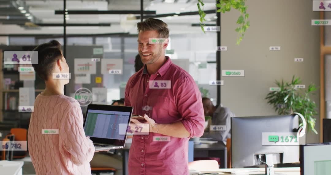 Two coworkers standing in modern office environment engaged in discussion, with digital graphics depicting social media notifications appearing on screen. Scene conveys teamwork and integration of digital technology in business settings. Useful for illustrating modern work practices, digital collaboration, and the impact of social media on professional environments.