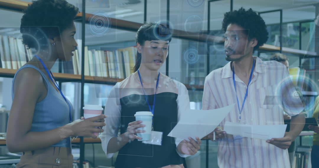 Multiracial team engaging in a brainstorming session with overlaying digital elements symbolizing innovation and modern communication. They hold coffee cups, reflecting a collaborative and dynamic working atmosphere. Ideal for illustrating concepts of teamwork, diversity, and futuristic technology in workplace settings or for materials on corporate innovation and agile methodology.