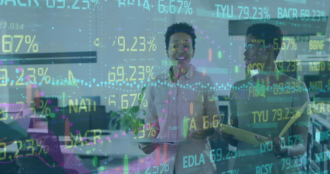 - Diverse Coworkers Discussing Amid Financial Graph Overlay Office