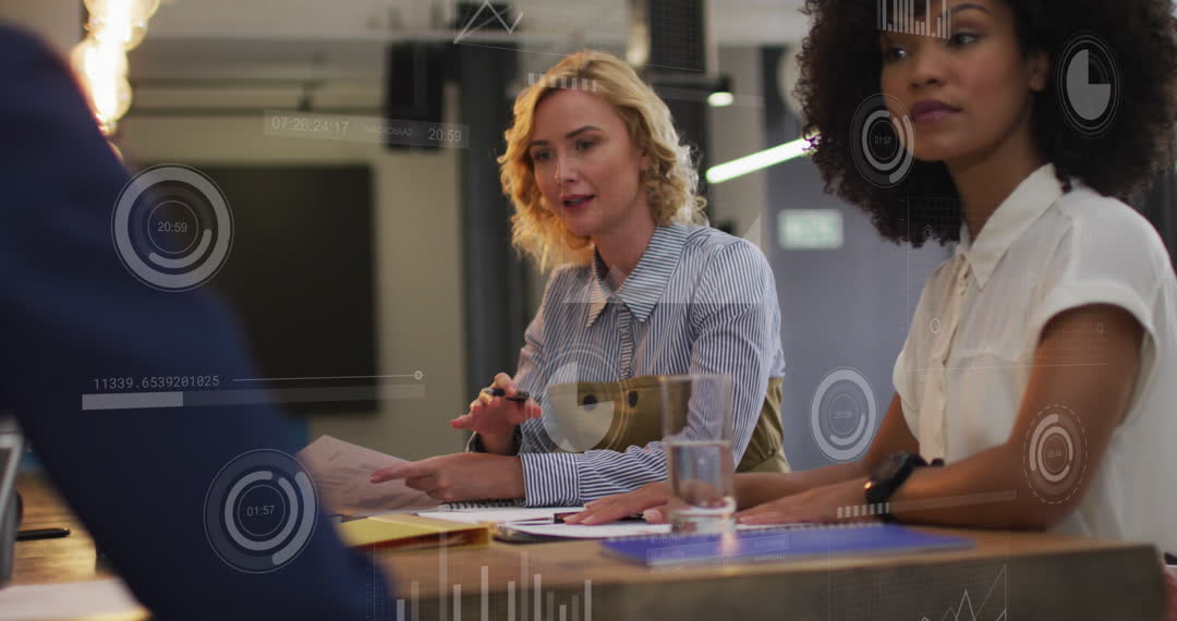 - Diverse Coworkers Discussing Business Strategies with Data Overlay