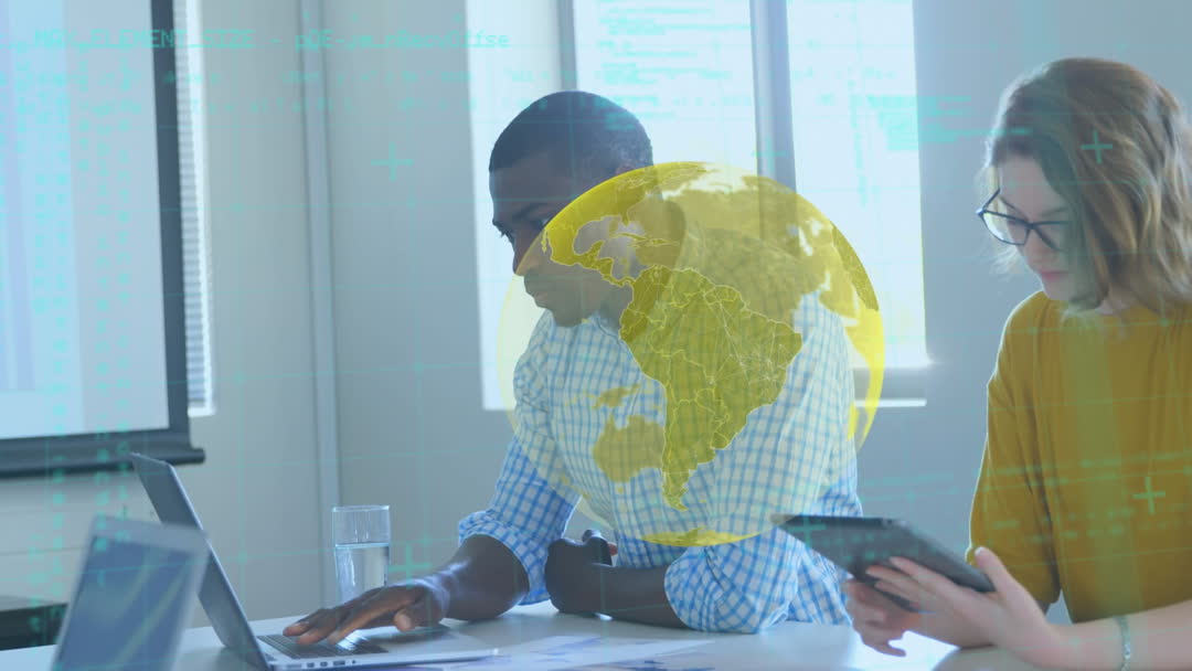 Diverse coworkers are in a modern office environment, focusing on digital devices while an animation of a globe overlays. This scene represents global connectivity, teamwork, and innovative business solutions. It can be used in articles and content related to technology in business, multi-cultural teamwork, networking, digital globalization, and modern-day office dynamics.