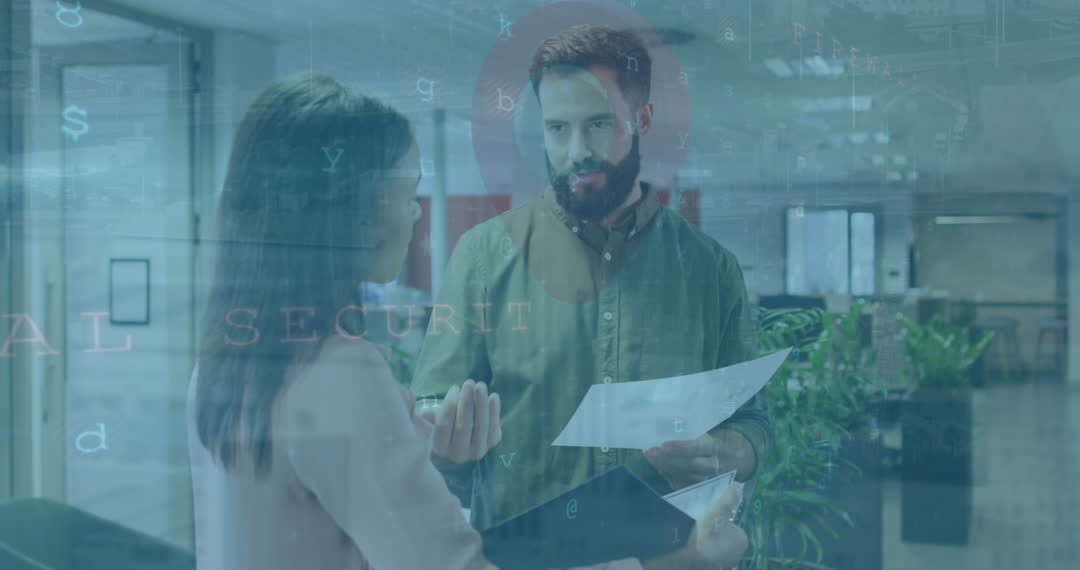This video blends the concept of teamwork with digital security, showing diverse coworkers engaged in a discussion. With digital graphics including texts and security-related elements overlaid, this is ideal for illustrating articles on data analysis, cybersecurity, corporate communication, and office collaboration. Its visually engaging composite style can enhance content related to technology and modern business environments.