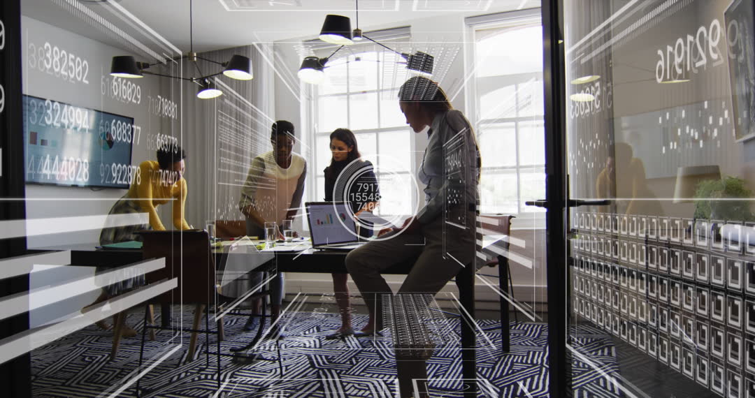 - Diverse Coworkers Engaged in Business Strategy Meeting with Digital Overlay