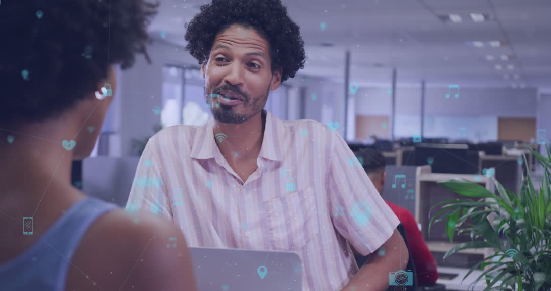 Colleagues engaging in a friendly conversation at their workstation, surrounded by digitally animated connected icons that suggest technology integration in communication. The modern office background complements the theme of innovative, collaborative workspaces. Ideal for representations of business communication, collaborative teamwork, and tech-driven office environments.