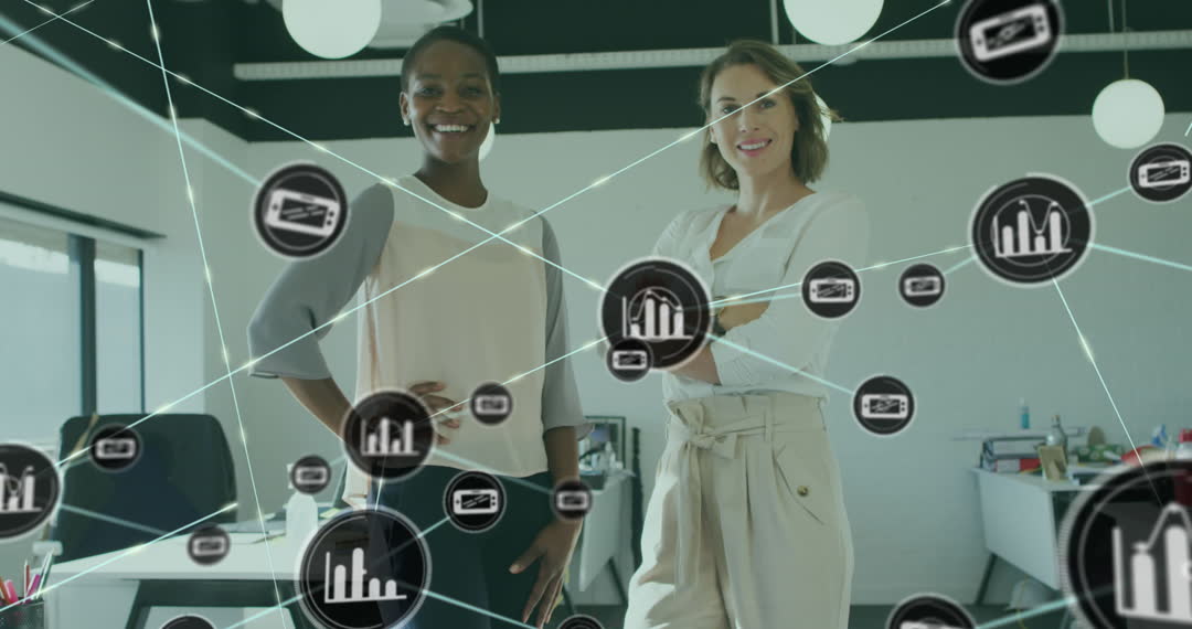Two smiling professionals shown in a collaborative office environment, connected by digital network symbols, representing communication, teamwork, and innovative office technology. Useful for illustrating concepts of diversity in the workplace, advanced data sharing, and digital innovation in team settings.