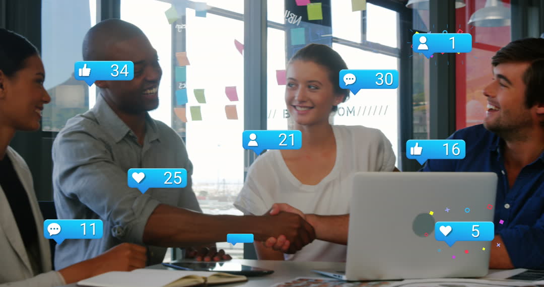 - Diverse Coworkers Shaking Hands with Social Media Icons Overlay
