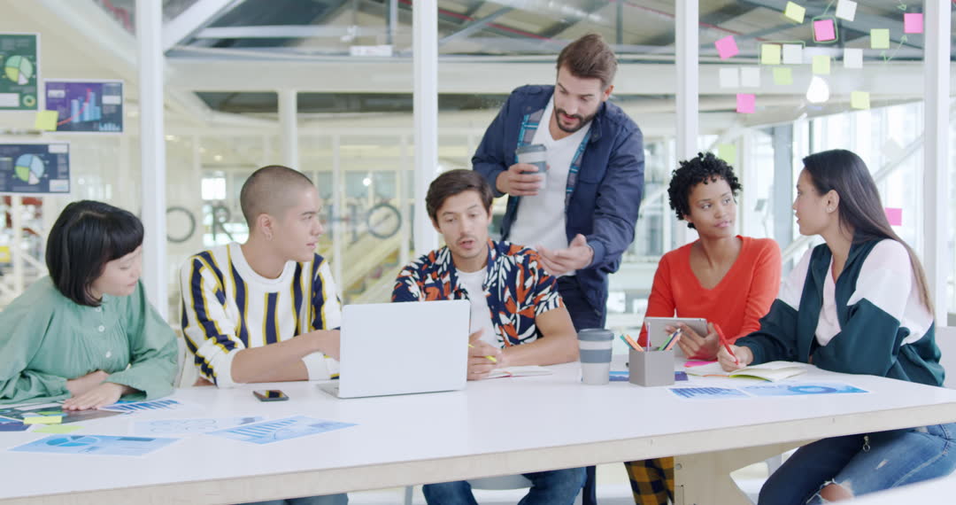 A group of diverse, young creative professionals engage in a lively discussion around a laptop in a modern office. This setting, characterized by notes and documents on the table, suggests a brainstorm or strategy session. The video is ideal for illustrating the concepts of teamwork, creativity, and corporate environments in marketing materials, websites focusing on workplace culture, or for articles on creative collaboration.