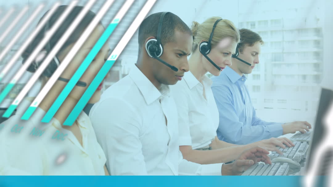 Diverse group of business people wearing headsets, collaborating at call center desks with digital graphics. Ideal for depicting themes of multicultural teamwork, modern business environments, or customer service technology.