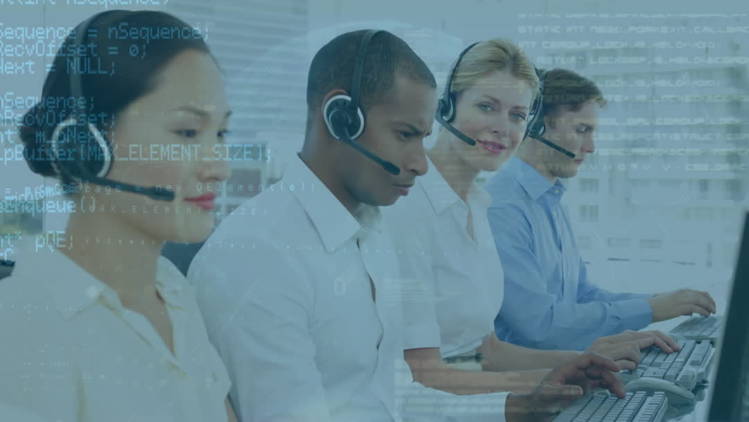 The scene depicts diverse customer service professionals in an office setting, using headsets and working on computers. Overlaid with computerized data illustrations, this symbolizes modern technology in data management and communication solutions. The video can be used to represent a professional and diverse work environment, highlighting technologies used in customer support and corporate teamwork.