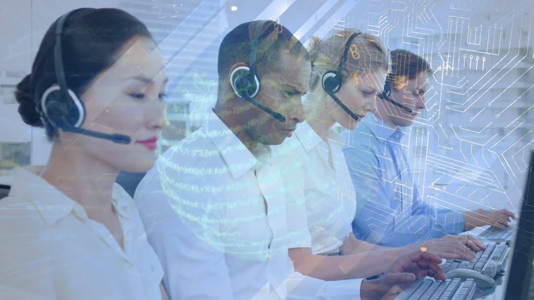 Multicultural call center professionals wearing headsets working together in a modern office setting. Overlay of digital connections and tech circuits symbolizes innovation in communication and business technology. Useful for depicting teamwork, diversity in tech, modern customer support services, or the integration of digital solutions in business environments.