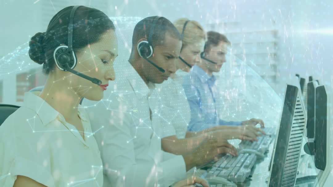 Depicting a focused team of diverse customer service representatives working diligently at computers while wearing headsets. Overlapping digital graphics illustrate a global network, symbolizing modern communication and connectivity. Ideal for use in marketing materials for tech companies, businesses emphasizing international reach, and content on modern office environments.