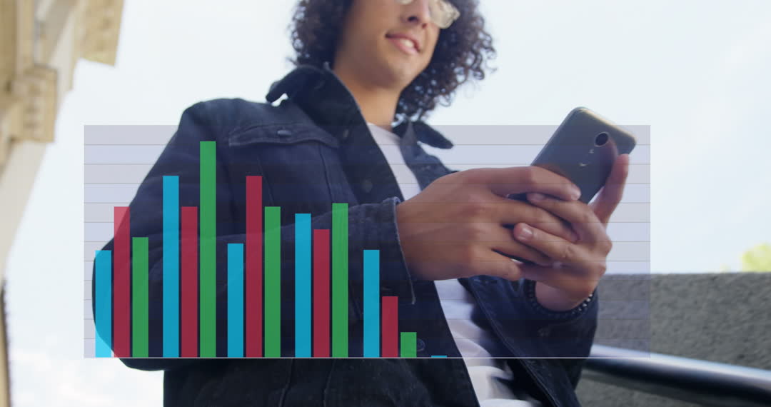 Young man holding smartphone with superimposed bar graph demonstrating data analytics in modern technology. Perfect for illustrating digital business solutions, mobile application development, or promoting awareness about learning difficulties and tech support.