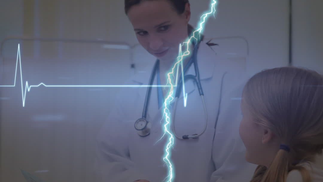 This visualization concept intertwines real-world medical interaction and advanced data graphics, showcasing a healthcare professional consulting a patient. The animated cardiogram and lightning illustrate dynamic aspects of health monitoring and medical technology. Ideal for thematic video promotions, medical education material, or healthcare industry promotions focusing on patient care technology.