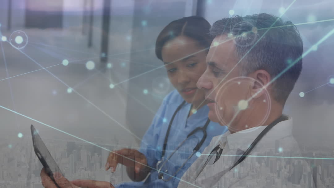 Two doctors of diverse backgrounds collaborating over a digital tablet, with an overlay of network connections symbolizing digital communication and global medicine concepts. Suitable for illustrating modern healthcare technology advancements, collaborative medicine, and diverse medical teams in various health industry materials.