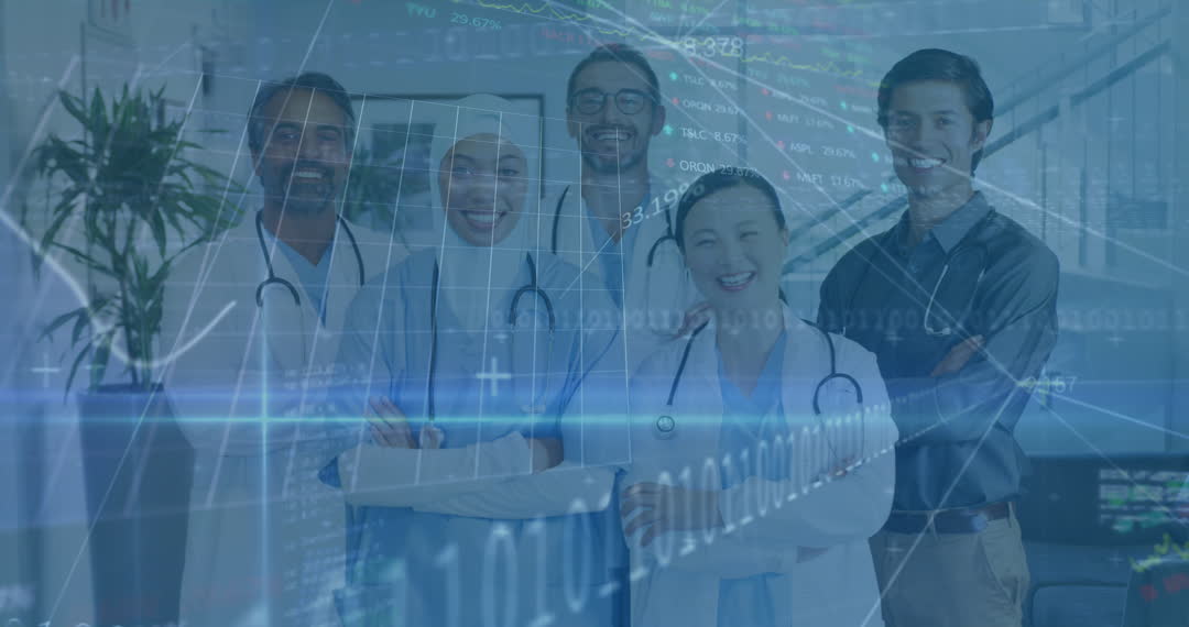 Diverse group of healthcare professionals standing confidently as digital data and analytics symbols overlay the scene, representing integration of technology in medical industry. Useful for content highlighting developments in digital healthcare, data analysis in medicine, and diverse teamwork in healthcare settings.