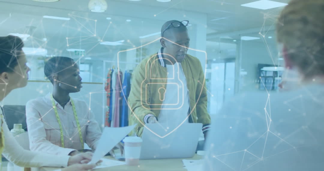 This stock represents a group of diverse fashion designers collaborating in a modern office environment, with a digital overlay of connected dots and a padlock in a shield symbolizing security and teamwork. Ideally used for promoting creative industries, collaborative teamwork, data protection in creative fields, or modern office space solutions.