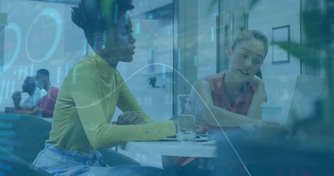 Two women working together on a financial project in an office setting with digital charts overlay. Great for illustrating concepts of teamwork, financial analysis, and use of technology solutions in business environments; useful for websites and presentations focusing on diversity, finance, and professional collaborations.