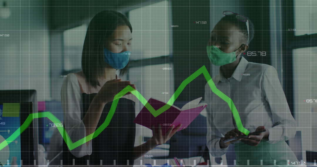 Two diverse female colleagues in an office wearing face masks engaged in a discussion, analyzing market trends. A green financial graph overlay accentuates the theme of data analytics and business insights. Ideal for themes related to corporate teamwork, modern business practices, or pandemic-associated workplace scenarios. Suitable for articles on financial news, data analysis, or office life adaptations.