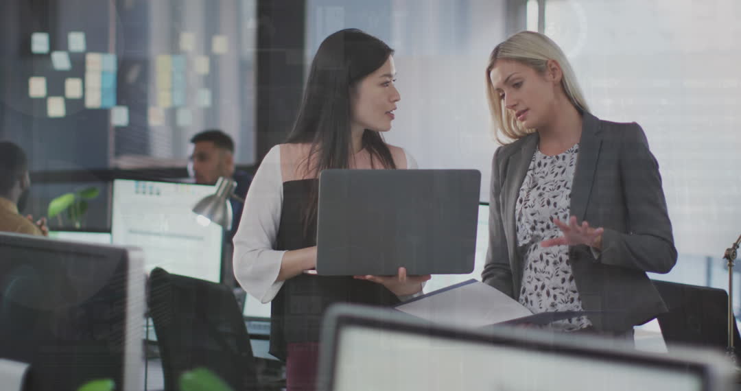 - Diverse Female Colleagues Collaborate with Digital Interface Overlay