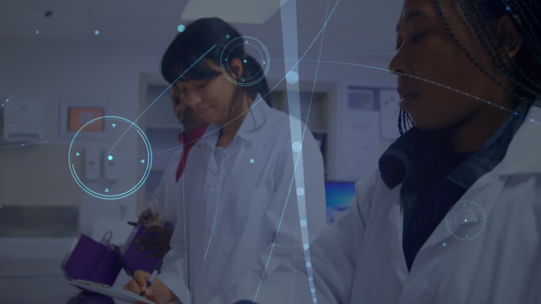 Diverse female doctors in lab coats interacting with animated digital connections overlay, symbolizing technology in healthcare and data sharing. Ideal for illustrating themes of global connectivity, modern medical practices, and diverse teamwork in healthcare environments. Suitable for projects focusing on innovation, collaboration in medicine, or advancements in scientific research.