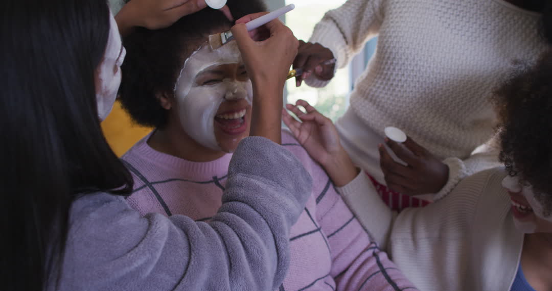A group of diverse friends are applying face masks on each other, creating a relaxed and joyful atmosphere. They are laughing and enjoying quality time together, highlighting a theme of friendship and self-care. This video can be used for promoting skincare products, beauty salons, or articles about friendship and wellness activities.