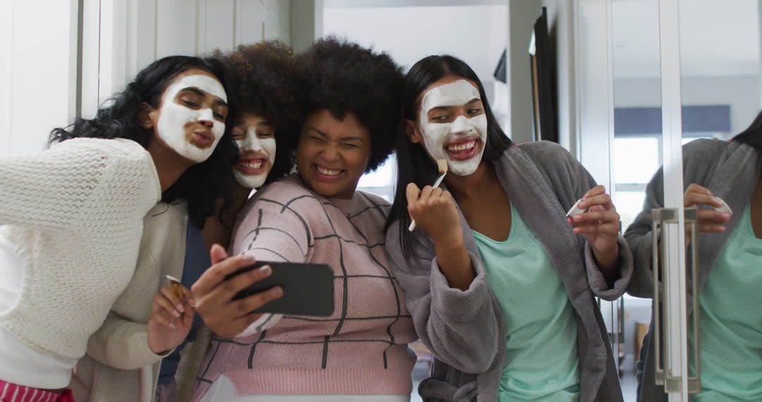Group of friends smiling while applying facial masks and taking a selfie. Represents themes of friendship, skincare routines, and having fun together. Useful for beauty and lifestyle promotions, articles on self-care, and advertisements for skincare products.